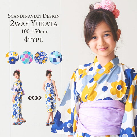 【お買い物マラソン・激得クーポン配布中ッ!】送料無料! スカンジナビアン 北欧デザイン 子供 2way 浴衣 サンドレス 3点セット 4柄 6サイズ 100cm 110cm 120cm 130cm 140cm 150cm ワンピース浴衣 クリーム ピンク 青紺 モダン&キュート